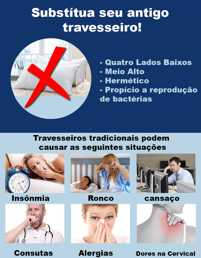 O travesseiro Ergonômico - Pro Sono foi desenvolvido no exterior com as mais modernas tecnologias que contribuem com o sono perfeito. Chega de insônia, ficar procurando a posição correta ao se deitar, ronco excessivo, dores na coluna entre outros fatores, confira seus benefícios a seguir: